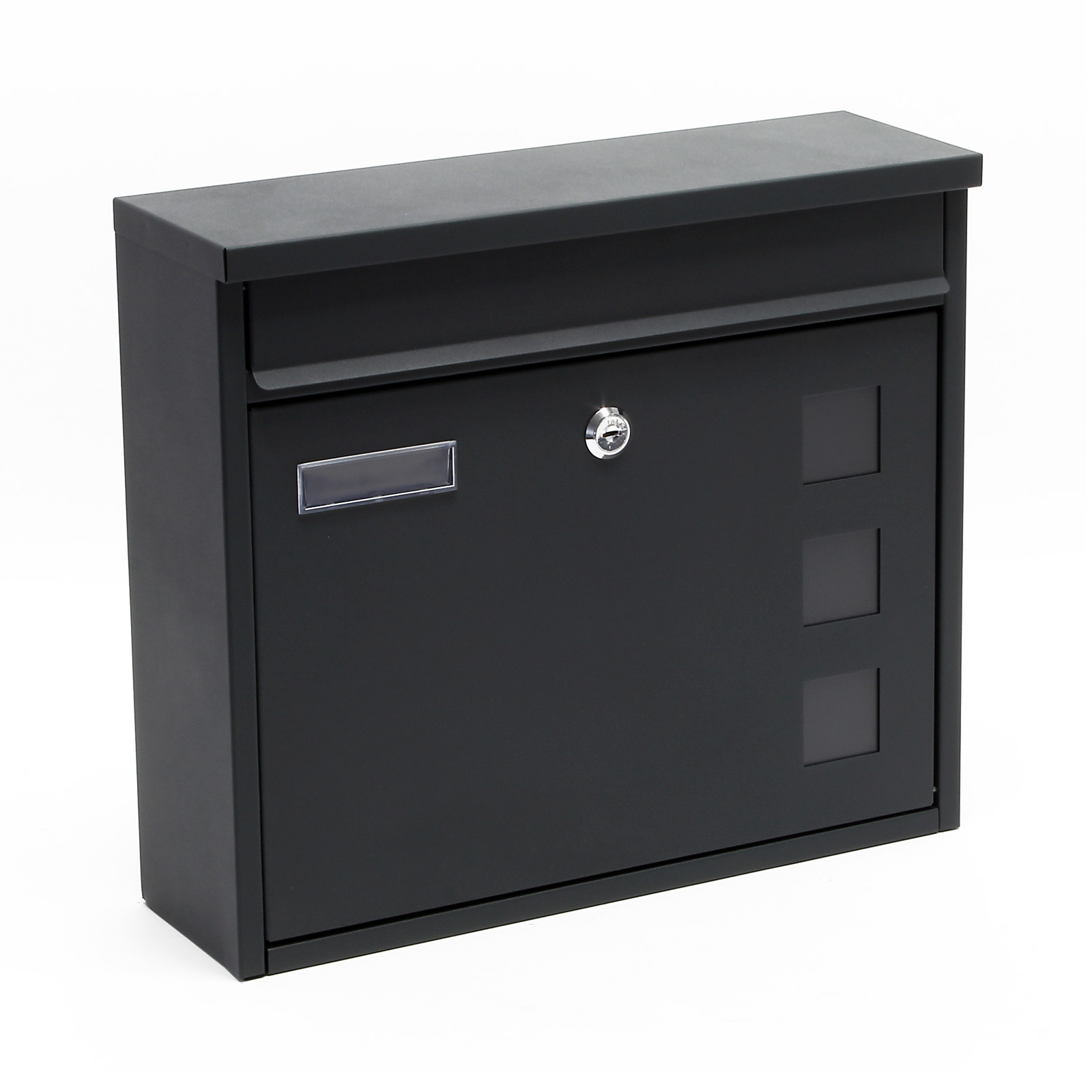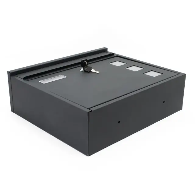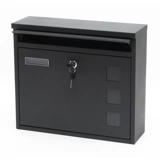 Nabiralnik ima veliko režo za pisma, je zaklenjen in ima dva ključa.