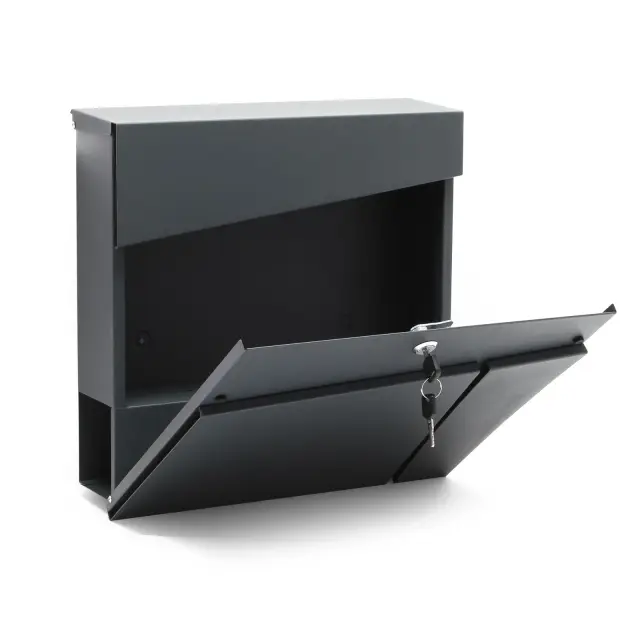 Dizajnerski nabiralnik iz pocinkanega jekla antracit črne barve. Vključen je tudi material za namestitev. Na spodnji strani je tudi predal za časopis. Dimenzije 370 x 370 x 105mm