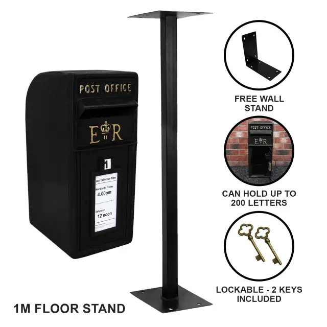 Poštni nabiralnik za vsako priložnost! Čudovito pristen črn poštni nabiralnik Royal Mail s talnim stojalom je odličen dodatek za vaš dom ali vrt. Škatla iz litega železa, odporna na vodo in rjo, pomeni, da je idealna za uporabo na prostem. Sijajna barva bo ohranila popoln videz, tudi če jo uporabljate na vašem vrtu ali pred vhodom.