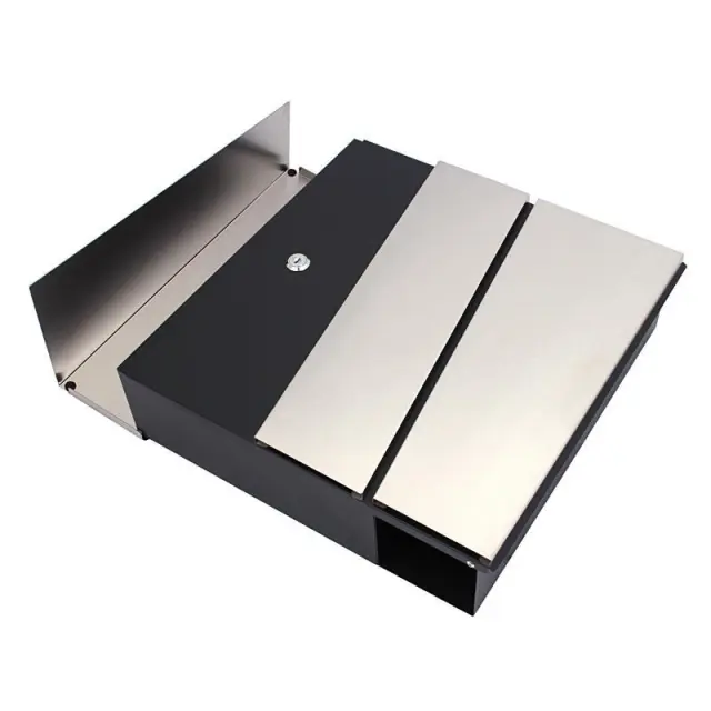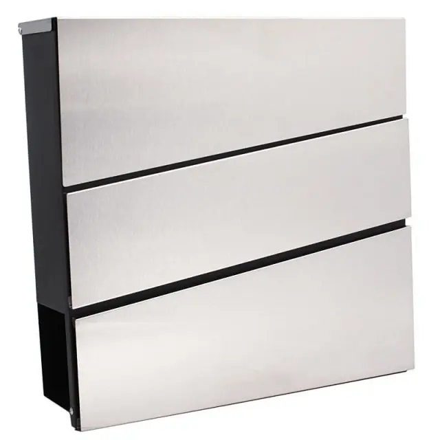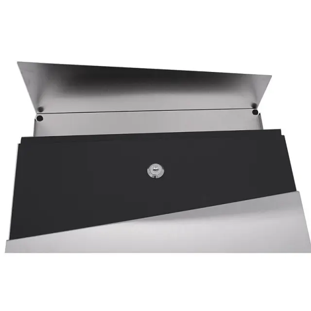 V kompletu sta dva ključa in stenski čepi z vijaki, ki sta potrebna za pritrditev škatle. višina: 37cm širina: 37cm debelina 10cm reža: 33.5×3.5cm časopisne cevi: 9x8cm