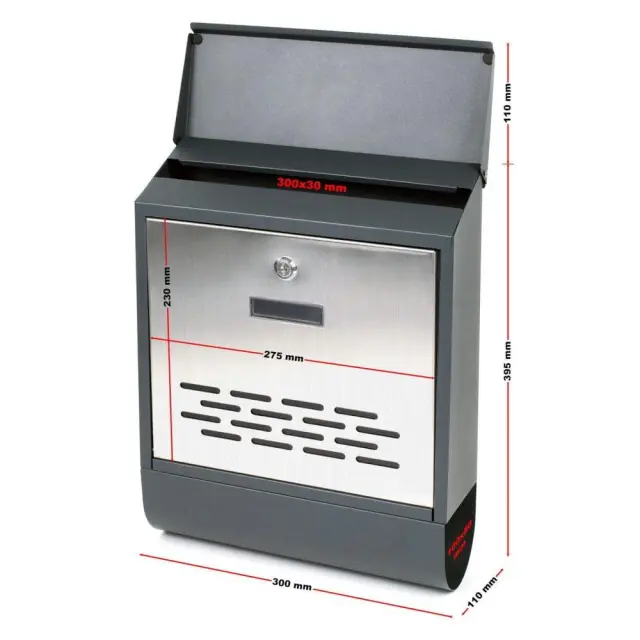 Na videz zunanje površine lahko vplivamo s poštnim nabiralnikom. Nabiralnik bi torej moral biti sposoben narediti več kot le shranjevanje pošte. Namesto tega je dekorativni dodatek vašemu bivalnemu konceptu. Ta nabiralnik ustreza kriterijem in je popolna kombinacija modernosti in funkcionalnosti. Nabiralnik je izdelan iz pocinkanega jekla in nerjavnega jekla 304. Ima veliko režo za pošto, se zaklepa in ima dva ključa. Priložen je tudi montažni material. Na spodnji strani je tudi predal za časopise, tako da časopisov ni treba več puščati mokre pred vhodnimi vrati, ampak jih je treba na suhem mestu, dokler jih ne prinesejo v hišo. Minili so dnevi, ko je bil časopis stisnjen v poštno režo in ni bilo prostora za preostalo pošto. Tudi če niste doma, vam nabiralnik ponuja dovolj prostora za shranjevanje vaših pisem. DIMENZIJE: Nabiralnik: 300 x 395 x 110 mm MATERIAL: pocinkano jeklo + nerjaveče jeklo (304) DEBELINA MATERIALA V MM: 0,51