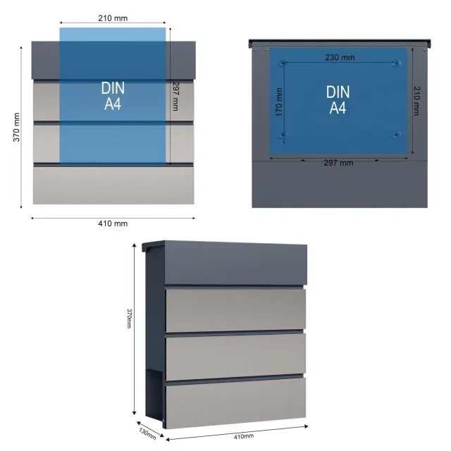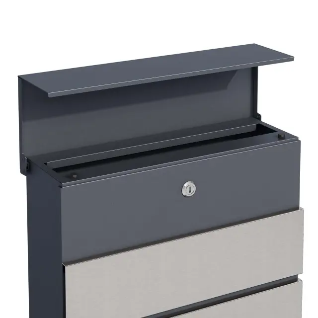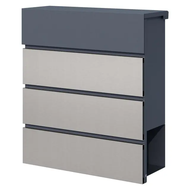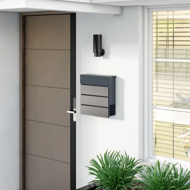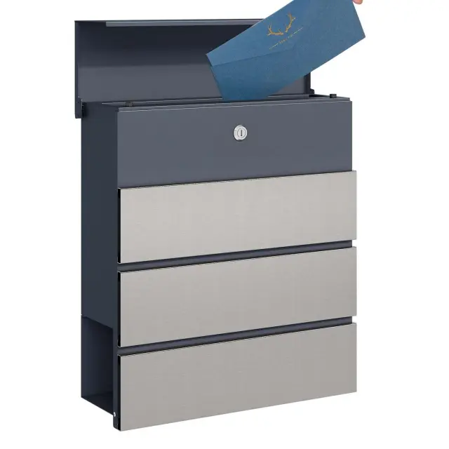 S poštnim nabiralnikom V64 lahko pozitivno vplivate na videz zunanjega prostora. Njegov sprednji del je sestavljen iz elementa antracitne barve in treh elementov iz nerjavečega jekla, kar daje preprost, a sodoben dizajn. Nabiralnik je namenjen za montažo na steno in je dekorativni dodatek k vašemu bivalnemu konceptu.