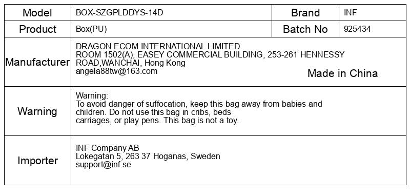 Opozorilo: Da preprečite nevarnost zadušitve, hranite to torbo stran od dojenčkov in otrok. Te vrečke ne uporabljajte v otroških posteljah, posteljnih vozičkih ali igralih. Ta torba ni igrača.