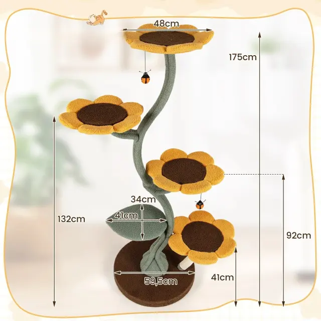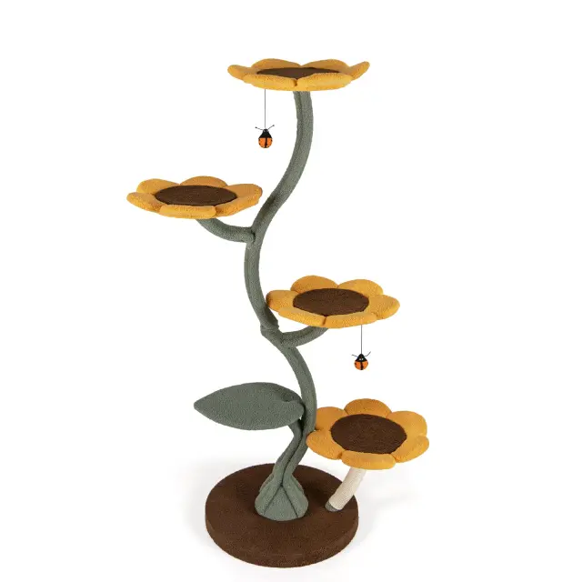 Iščete elegantno drevo za mačke, ki bo vašemu domu dodalo pridih narave? To elegantno mačje drevo z motivom sončnic ima 4 ploščadi v obliki cvetov in eno ploščad v obliki listov, ki v vašo dnevno sobo vnesejo živahnost in eleganco. Vsak podest je opremljen z mehko gobasto blazino in koži prijazno medvedjo volno, ki vaši mački zagotavljata udoben počitek. Sodobna zasnova vključuje praskalnike, ki zadovoljijo naravni instinkt praskanja vaše mačke in zaščitijo vaše pohištvo.