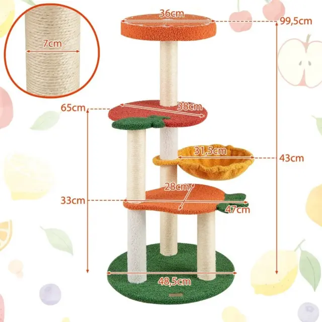 To elegantno drevo za mačke je živahen in barvit dodatek za vsak dom. Oblikovano je z očarljivim motivom sadja in ima spodnji podstavek v obliki korenčka, srednji podstavek v obliki jabolka in oranžno zgornjo gredico. Barvita in raznolika zasnova zagotavlja neskončno zabavo za mačke.