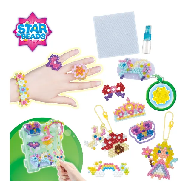 Komplet Fairy World vključuje več kot 820 zvezdnih, trdnih in draguljnih perlic v 16 barvah, dodatke (tiara, sponka za lase, zapestnica, broška, prstani, obeski), stojalo za kreacije, obroče za dizajn, pladenj, razpršilo, predloge in navodila. Nove zvezdne perlice, ki izgledajo kot majhne zvezde, dodajo teksturo in omogočajo ustvarjanje novih Aquabeads kreacij!