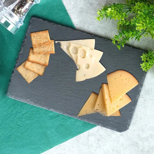 Izdelan iz visokokakovostnega skrilavca, ta servirni pladenj zagotavlja trajnost in odpornost proti praskam ter madežem, kar ga dela idealno izbiro za strežbo hrane in pijače na zabavah, piknikih ali celo za vsakodnevno uporabo v vaši kuhinji.