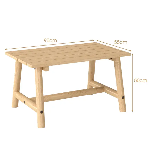 Izboljšajte svoj zunanji prostor s to trpežno mizico za kavo na terasi, izdelano iz masivnega lesa bora in jelke. Z robustnimi, 6 cm debelimi nogami in dodatnim prečnim nosilcem za podporo lahko ta mizica za kavo na prostem prenese do 125 kg. Njena naravna lepota in elegantna oblika z letvicami in edinstveno strukturo lesa izboljšata estetiko vaše terase, vrta ali dnevne sobe. Ta vsestranska mizica je zasnovana za notranjo in zunanjo uporabo, z gladko lakirano površino pa jo je enostavno vzdrževati. Da bi zagotovili daljšo življenjsko dobo, se izogibajte izpostavljenosti dežju. Več premišljenih podrobnosti čaka, da jih odkrijete.