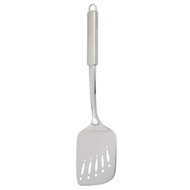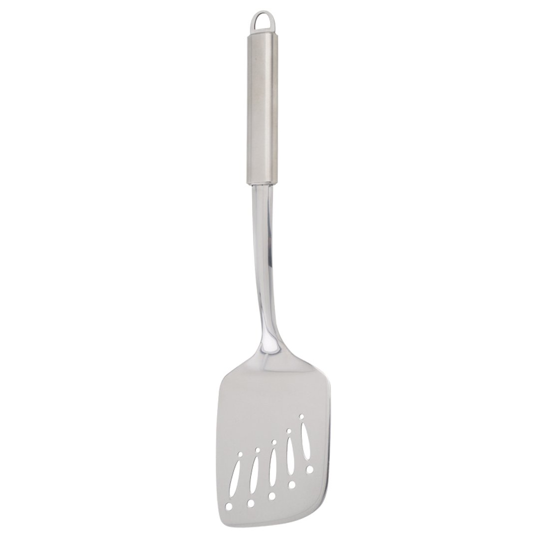 Perforirana pravokotna lopatka Disegna je izdelana iz nerjavečega jekla dolžine 37 cm. Njen spodnji pravokotni del širine 9 cm omogoča enostavno obračanje zrezkov, zelenjave in ostalih jedi. Odebeljen ročaj za enostavno rokovanje ima na vrhu odprtino, ki je idealna za obešanje kuhinjskega pripomočka po njegovi uporabi. Primerno za pomivanje v pomivalnem stroju.
