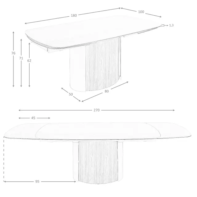 Ta jedilna miza ima naslednje značilnosti 2razširljiv iz 45 cm., in se lahko razširi od 180 do 270 cm.