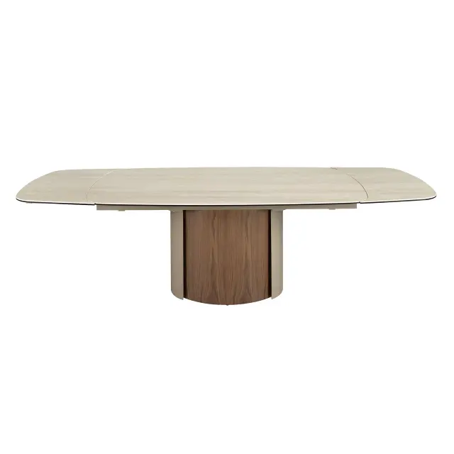 Pravokotna raztegljiva jedilna miza s sodobnim dizajnom in porcelanasto marmornato ploščo peščene barve v mat izvedbi. Noge iz nerjavnega jekla, lakirane v peščeni barvi s kovinskim učinkom, in naravni orehov furnir debeline 0,5 mm ter njena prilagodljivost jo naredijo popolnoma funkcionalen in vsestranski kos pohištva za vsakdanjo uporabo.