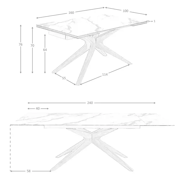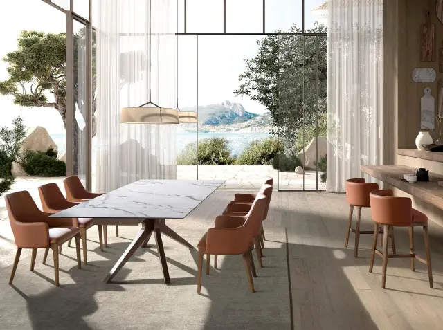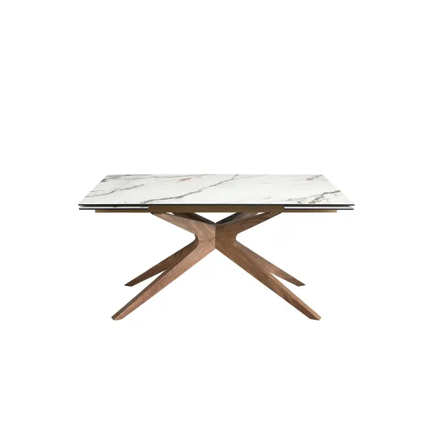 Pravokotna raztegljiva jedilna miza iz porcelanskega marmorja in oreha