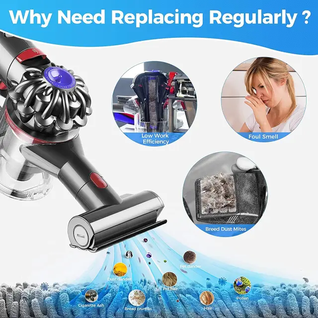 Komplet dodatne opreme s pred in naknadnim filtrom, združljiv z Dyson V7 in V8. Ti filtri za sesalnik blokirajo majhne delce in zagotavljajo pravilno in visoko zmogljivo delovanje sesalnika. Dobavljeno v kompletih s 4 kosi in čistilno krtačko.