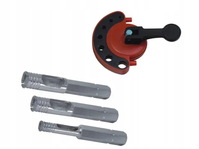 Profesionalni centrirni vodnik za mokro vrtanje v stenske in talne ploščice z diamantnimi svedri. Zasnova vodila omogoča dovajanje vode neposredno v sveder. Z uporabo priključnih vtičnic je možno vodilo priključiti na hidroneto z vodo. Preprečuje zdrs svedra po površini ploščice. Vsekakor olajša in pospeši delo. Zagotavlja visoko natančnost vrtanja. Močna priseska omogoča varno pritrditev v navpičnem in vodoravnem položaju. 7 pilotnih lukenj s premeri: 4, 5, 6, 7, 8, 10, 12 mm. 3 diamantni svedri s premerom 6, 8, 10 mm za kamnino, terakoto, steklo, belo keramiko, kamen.