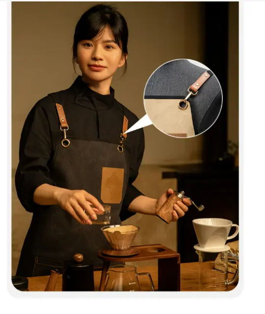 Visokokakovostno platno: Ta predpasnik, izdelan iz visokokakovostnega platna, je zasnovan za zahtevno okolje prometne kavarne. Je debel, trpežen in izdelan tako, da prenese vsakodnevno obrabo.