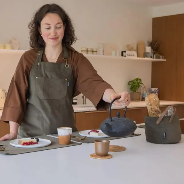 Predpasnik Velmar je izdelan iz bogate rebraste velur tkanine s skrbno uravnoteženo mešanico bombaža in poliestra, ki združuje mehkobo naravnih vlaken z vzdržljivostjo umetnih. Njegove naravne, zemeljske barve ustvarjajo v kuhinji ali ustvarjalnem prostoru topel in umirjen ambient. Z zasnovo za vsakodnevno uporabo ponuja nastavljiv ovratni trak za popolno prileganje ter priročne sprednje žepe, v katerih boste imeli vse potrebne pripomočke vedno pri roki. | SESTAVA: 80% bombaž, 20% poliester. | VZDRŽEVANJE: Pranje v pralnem stroju na 30°C. Perite ločeno. Sušenje v sušilnem stroju ni dovoljeno. Likanje ni dovoljeno. Beljenje ni dovoljeno. Kemično čiščenje ni dovoljeno.