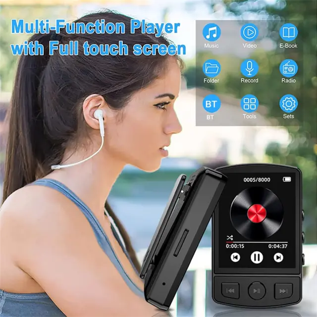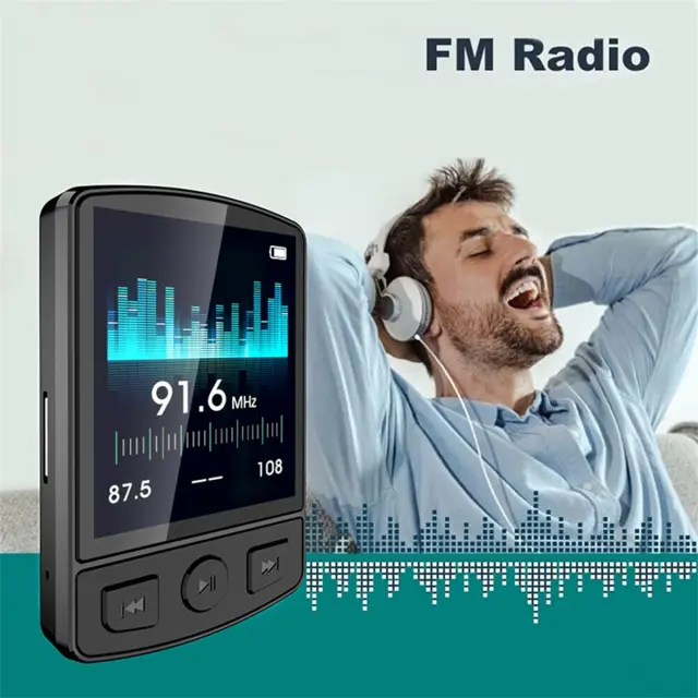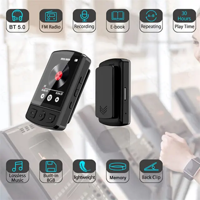 Podpora za kartice TF – Vključuje kartico TF s kapaciteto 32 GB, podpira razširitev do 128 GB za filme, glasbo in dokumente. Odlična kakovost zvoka – formati brez izgub (MP3, WMA, APE, FLAC, WAV) in inteligentni čip za zmanjšanje šuma za čist zvok. Tehnologija Bluetooth 5.0 – hiter prenos, stabilna povezava in nizka poraba energije; združljiv s slušalkami in zvočniki. Preprost in prenosen – polnjenje prek USB-ja, vsestranski za šport, potovanja in učenje, s sponko za priročno uporabo na poti.