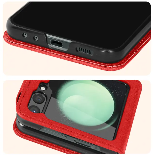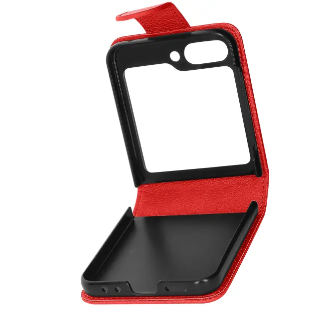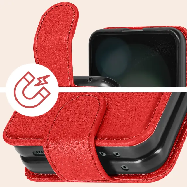 Preklopna školjka, ki šciti Samsung Galaxy Z Flip 5 in ga hkrati elegantno oblece. Zasnovan je bil po meri in se ujema z obliko pametnega telefona. Objame mobilni telefon in ga popolnoma zavaruje z magnetnim jezickom.