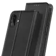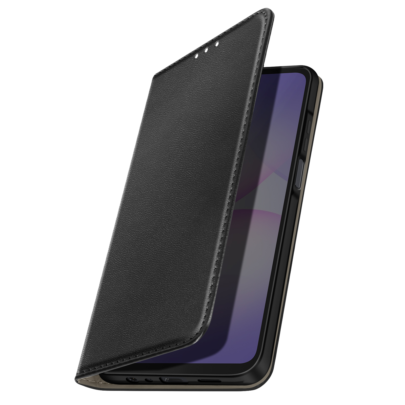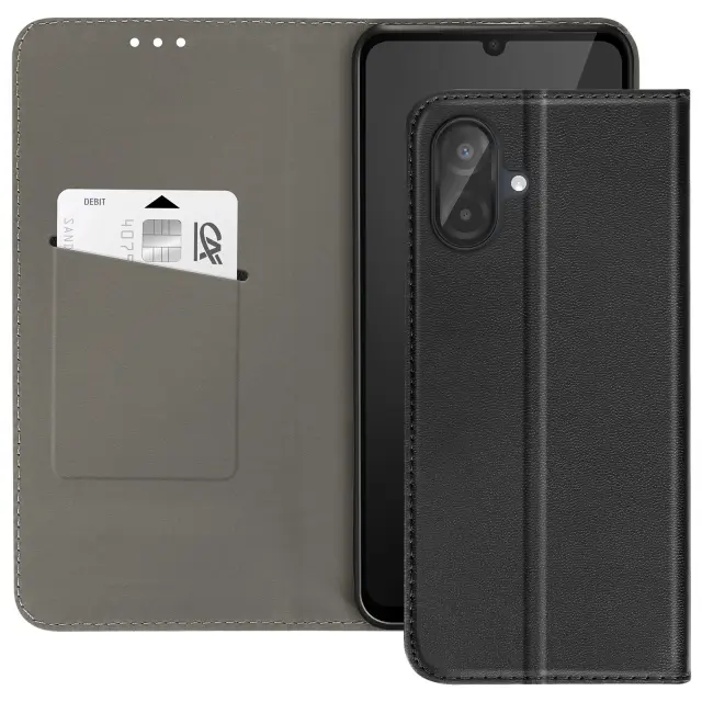 To črno ohišje ščiti vaš Samsung Galaxy A07 z natančnim magnetnim zaklopom in mehko notranjo lupino, ki absorbira udarce.. Oblikovana prevleka z videzom usnja je mehka na otip in učinkovito zmanjšuje prstne odtise.. V notranjosti je reža za kartice ali značko, obložena z mehko mikrovlakenco, odporno na praske.. Zložljiv zavihek tvori stabilno vodoravno oporo za gledanje videoposnetkov ali prostoročno klicanje..