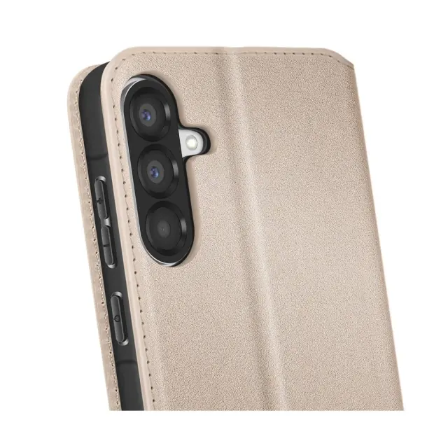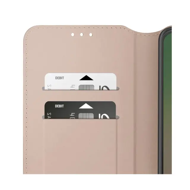 Folio etui z varnim, diskretnim magnetnim zapiranjem. Dve reži za kartice, integrirani v zavihku. S funkcijo podpore videu, ki je idealna za klice ali filme. Eko usnje v zlati barvi s finim zaključkom in vidnimi šivi.