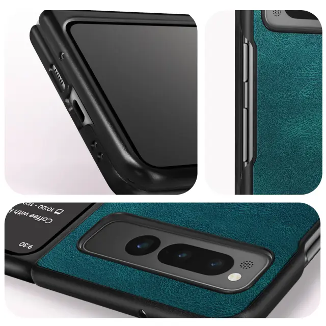 Zašcita iz umetnega usnja, posebej zasnovana za Google Pixel Fold, sestavljena iz zadnjega pokrova in ovojnega okvirja. Povecana zašcita pred udarci, padci in razlicnimi udarci. Po meri rezani gumbi in vrata. Prevleka mehka na dotik.