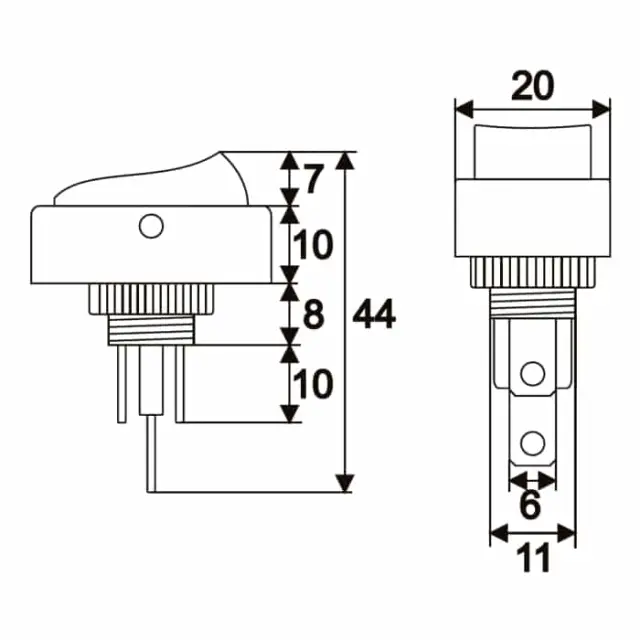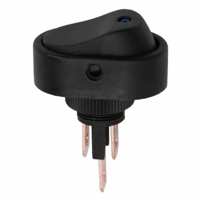Vgradno, črno, preklopno stikalo z LED diodo. Široko uporabno, idealno za avtomobile, električne nadzorne plošče itd. LED dioda olajša določitev statusa stikala.