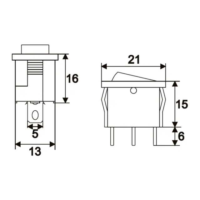 Tip stikala: SPST (enopolno)OFF-ON (znak I-O)Moč / napetost: 6 A - 250 VAC (10 A - 125 VAC)3 pin (s 4,8 mm priključki)Izrez: 19,5 x 13 mm pribl.Skupne dimenzije: 21 x 15 mm pribl.Barva: črno ohišje z zeleno osvetlitvijo
