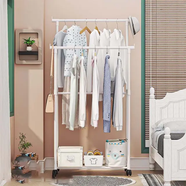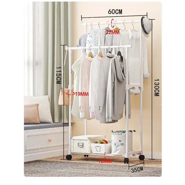 Premično talno stojalo za oblačila z dvojno palico za organizirano shranjevanje White