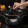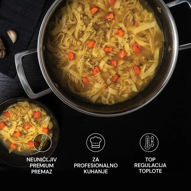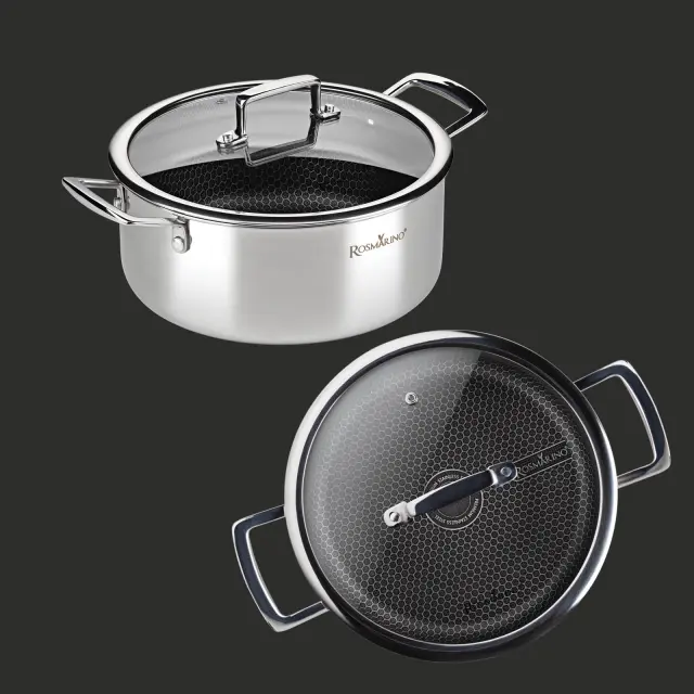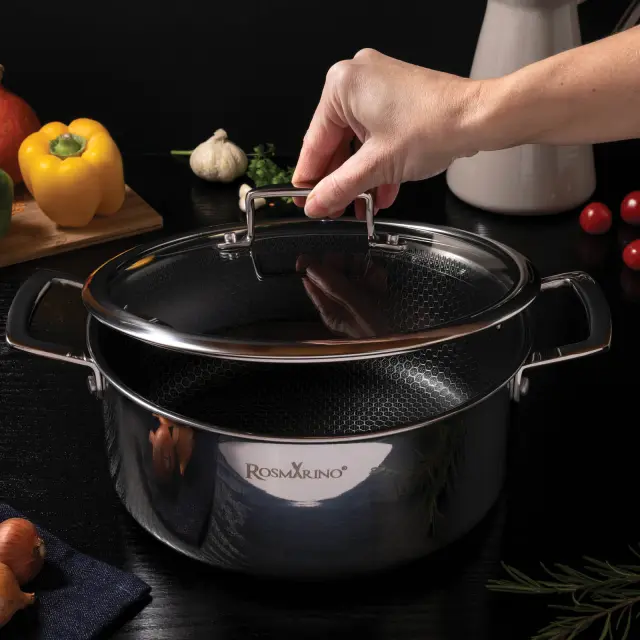 Linija premium posode Rosmarino HexaPRO je prava izbira za tiste, ki želite doseči profesionalne rezultate pri kuhanju. S svojo izjemno vzdržljivostjo in napredno hibridno tehnologijo poskrbi za popolno enakomerno kuhane jedi. Odlikuje jo premium neuničljiv premaz, ki je odporen proti praskam. Brez kompromisov jo lahko uporabljaš na vseh vrstah kuhalnih plošč in tudi v pečici vse do 220 °C. To je premium posoda, ki tvoje kuharske veščine dvigne na višjo raven. Globok lonec omogoča kuhanje testenin, krompirja pa tudi pripravo juh, enoločnic in drugih jedi na žlico.