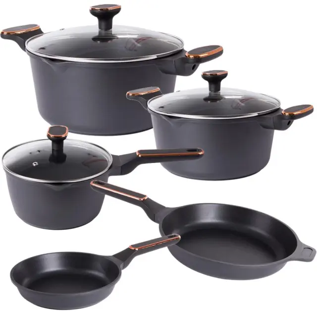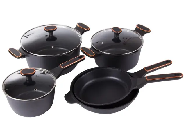 Set posode iz tlačno litega aluminija s premazom proti prijemanju je najboljša izbira za vašo kuhinjo. Za tovrstne lonce je značilna visoka vzdržljivost, enakomerna porazdelitev toplote in preprosto čiščenje.Zahvaljujoč premazu proti prijemanju , ki preprečuje prijemanje hrane. To vam omogoča, da pri pripravi obrokov porabite manj maščobe, kar pomeni bolj zdravo hrano.