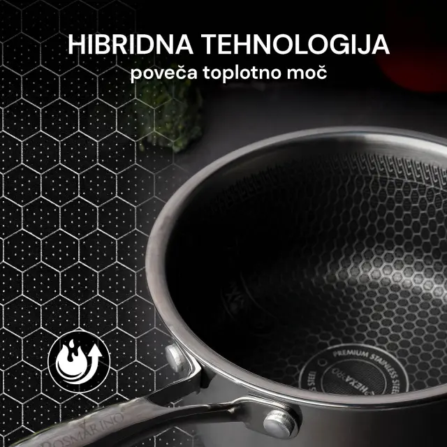 Linija premium posode Rosmarino HexaPRO je prava izbira za tiste, ki želite doseči profesionalne rezultate pri kuhanju. S svojo izjemno vzdržljivostjo in napredno hibridno tehnologijo poskrbi za popolno enakomerno kuhane jedi. Odlikuje jo premium neuničljiv premaz, ki je odporen proti praskam. Brez kompromisov jo lahko uporabljaš na vseh vrstah kuhalnih plošč in tudi v pečici vse do 220 °C. To je premium posoda, ki tvoje kuharske veščine dvigne na višjo raven. Pripravi pražen riž ali rezance z zelenjavo, mesom ali morskimi dobrotami, ki bodo po zaslugi voka hitro pripravljeni. Ljubitelji azijskih okusov si kuhanja brez njega ne boste znali več predstavljati.