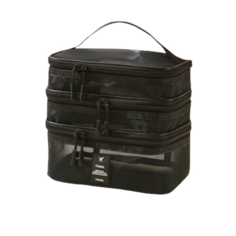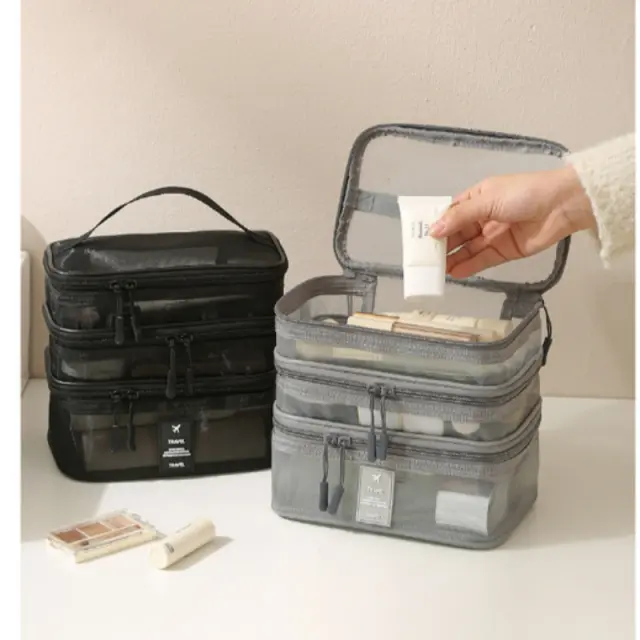 Konstrukcija iz najlonske mreže: Ta torba za shranjevanje kozmetike, izdelana iz visokokakovostne najlonske mreže, ponuja izjemno zračnost in vidljivost. Mrežasti material vam omogoča, da zlahka vidite vsebino vsakega predelka, kar vam prihrani čas in trud pri iskanju določenih predmetov. Robusten najlon zagotavlja, da so vaši predmeti zaščiteni pred razlitji in udarci, zaradi česar je zanesljiva izbira za vsakodnevno uporabo in potovanja.