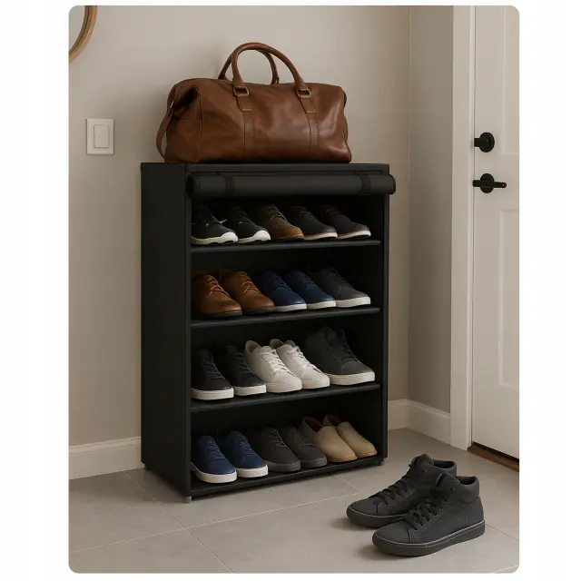 Poslovite se od razmetanih čevljev in neurejenega hodnika! Predstavljamo vam kompaktno in izjemno praktično prenosno omaro za obutev, ki s svojo višino 90 cm nudi popolno razmerje med prostornostjo in varčnim izkoristkom prostora. V elegantni črni barvi se diskretno poda v vsak ambient, od moderne veže do študentske sobe ali shrambe.