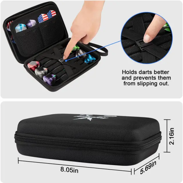 Trpežna konstrukcija iz EVA: Ta torbica za pikado je izdelana iz visokokakovostnega materiala EVA in nudi izjemno zaščito pred udarci, padci in vlago. Robustna zunanjost ščiti vaše pikado pred vsakodnevno obrabo in zagotavlja njihovo dolgo življenjsko dobo.