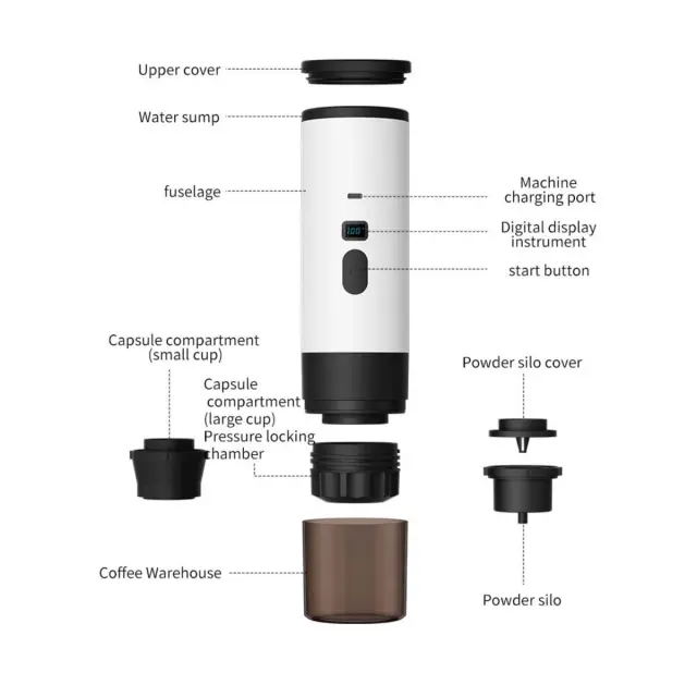 Priročnost na baterije: Ta prenosni aparat za kavo s kapsulami, ki ga napaja polnilna baterija, ponuja brezžično delovanje za vrhunsko udobje. Popolna napolnjenost omogoča več ciklov priprave kave, zaradi česar je idealen za potovanja in aktivnosti na prostem. Aparat je združljiv s polnjenjem USB, kar vam omogoča, da ga napolnite iz različnih virov napajanja. Kompaktna oblika in lahka konstrukcija omogočata enostavno prenašanje v torbi ali nahrbtniku. Delovanje na baterije odpravlja potrebo po vtičnicah, kar zagotavlja svobodo in prilagodljivost pri lokacijah priprave kave. Združljiv s standardnimi kapsulami, je popolna rešitev za ljubitelje kave na poti.