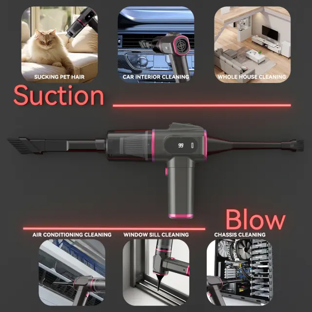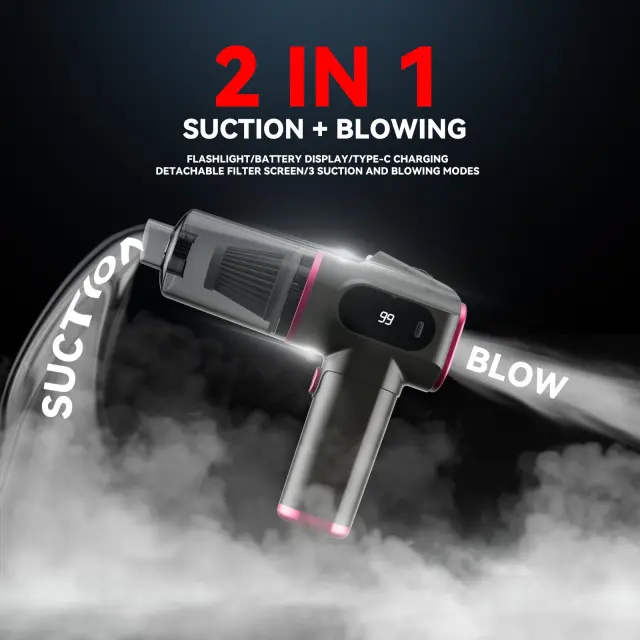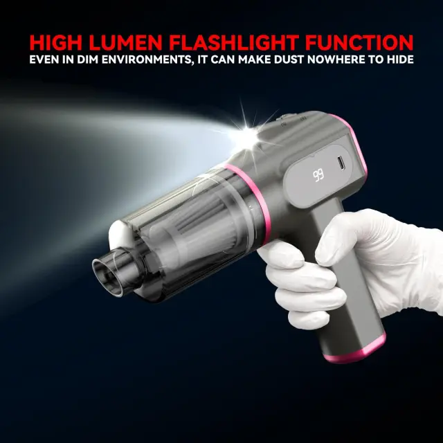 Brezžična priročnost: Uživajte v svobodi brezžičnega delovanja z našim ročnim sesalnikom. Njegova lahka zasnova in ergonomski ročaj zagotavljata udobno manevriranje, kar vam omogoča, da dosežete vsak kotiček vašega avtomobila brez težav z žicami. Polnilna baterija ponuja podaljšan čas delovanja, tako da lahko dokončate svoje naloge čiščenja brez prekinitev. Ta brezžična zasnova omogoča izjemno enostavno uporabo in shranjevanje, kar zagotavlja vrhunsko udobje za čiščenje na poti.