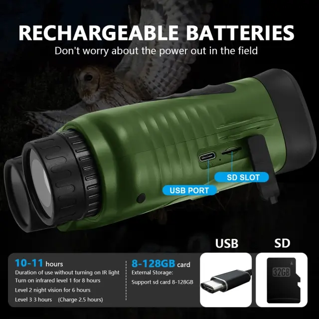 Uporabniku prijazen dizajn: Ta daljnogled za nočno opazovanje, zasnovan za enostavno uporabo, ima uporabniku prijazen vmesnik z osvetljenimi silikonskimi gumbi, ki jih je enostavno upravljati tudi v popolni temi. Stikalo z enim gumbom omogoča hitro in preprosto aktiviranje, kar zagotavlja, da nikoli ne zamudite ključnega trenutka. Daljnogled je tudi mogoče namestiti na stojalo, kar zagotavlja stabilnost za daljše oglede. Z 10 jezikovnimi možnostmi ta daljnogled skrbi za globalno občinstvo. Dolgotrajna baterija 2600 mAh ponuja do 8 ur neprekinjene uporabe pri najnižji infrardeči nastavitvi in do 11 dni v stanju pripravljenosti, kar zagotavlja zanesljivo delovanje med daljšimi aktivnostmi na prostem. Kombinacija intuitivnih kontrol, vsestranskih možnosti namestitve in dolge življenjske dobe baterije naredi ta daljnogled praktično in priročno orodje za vsako nočno avanturo ali nadzorno nalogo.