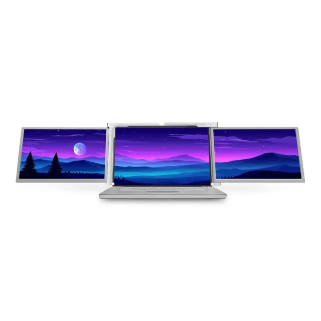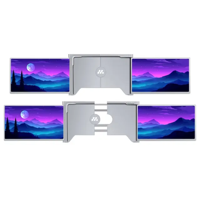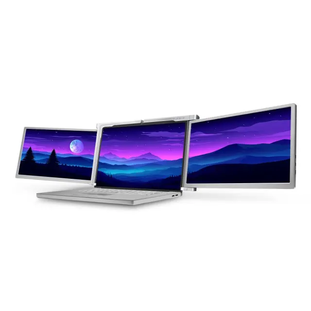 V zloženem stanju se monitorji natančno prilegajo drug drugemu, zato jih je enostavno prenašati. Zaradi integriranega stojala na zadnji strani lahko stojijo tudi samostojno, brez obremenjevanja tečajev zaslona prenosnika. Pametno, patentirano, preprosto.