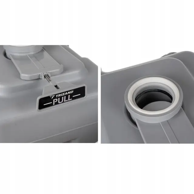 Spodnji del stranišča (posoda za odpadke) Spodnja posoda za odpadke ima prostornino 20 litrov , kar vam omogoča daljšo uporabo stranišča, ne da bi ga morali pogosto prazniti. Rezervoar je tesno zaprt, odpadki pa se odvajajo skozi veliko odprtino, zavarovano z loputo prekrito s silikagelom, ki dodatno preprečuje puščanje in neprijetne vonjave. Za izpraznitev zgornjega rezervoarja preprosto uporabite ročaj “PULL”, ki se nahaja na sprednji strani stranišča. Odtočna luknja se nahaja na zadnji strani straniščne školjke in je zavarovana s tesnim pokrovčkom , ki zagotavlja higiensko praznjenje rezervoarja. Poleg tega je blizu odprtine ročaj za lažje prenašanje in manipulacijo spodnjega rezervoarja.