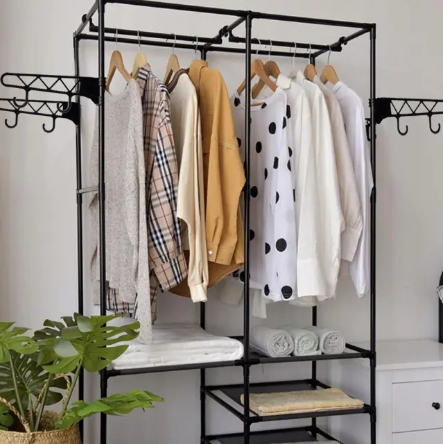 Ne glede na to, ali potrebujete dodatno shranjevalno rešitev v svoji garderobi ali pa iščete praktičen obešalnik za potovanja, je ta prenosni obešalnik s policami za oblačila odlična izbira. Organizirajte svojo garderobo na eleganten in funkcionalen način s tem črnim obešalnikom.
