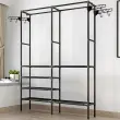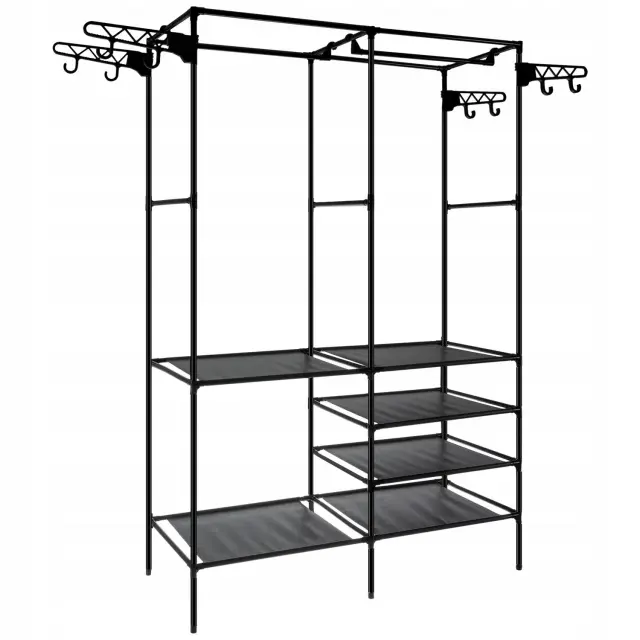 SPECIFIKACIJA – barva: črna; material: plastika + kovina; število polic: 6; število obešalnih palic: 2; število stranskih obešalnikov 8; mere: 173 x 36 x 108 cm; teža: 4,5 kg
