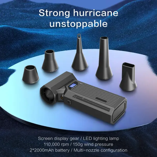 Močno odstranjevanje prahu: Doživite neprimerljivo moč čiščenja z našim prenosnim ročnim zračnim puhalnikom. Z visoko zmogljivim 29-milimetrskim motorjem in osupljivim 110000 RPM turbo ventilatorjem ta naprava zagotavlja impresivnih 180 G zračnega tlaka. Brez težav odstranite prah, ostanke in umazanijo s tipkovnic, elektronike, notranjosti avtomobilov in drugih težko dostopnih mest. Visokohitrostni jet ventilator zagotavlja učinkovito in temeljito čiščenje, zaradi česar je bistveno orodje za vzdrževanje brezhibnega okolja. Njegova kompaktna zasnova omogoča enostavno manevriranje in natančno ciljanje, kar zagotavlja, da ne ostane niti en sam prašni delec. Idealen za čiščenje občutljive elektronike, zapletenih strojev in občutljivih površin, ta zračni puhalnik zagotavlja varno in učinkovito alternativo tradicionalnim metodam čiščenja.