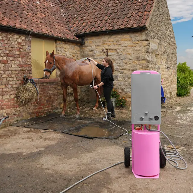 Jedro sistema je zmogljiv 36 kW baterijski bojler, ki lahko z izjemno učinkovitostjo segreva vodo od 0 do 75 °C. To zagotavlja, da vaš konj prejme dosledno toplo in pomirjujočo prho, kar je idealno za čiščenje po vadbi ali razvajanje. Velikodušna 18-litrska prostornina zagotavlja daljšo zalogo vode, zaradi česar je idealna za daljše ali bolj zahtevne kopalke.