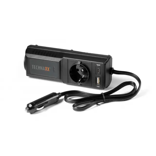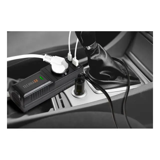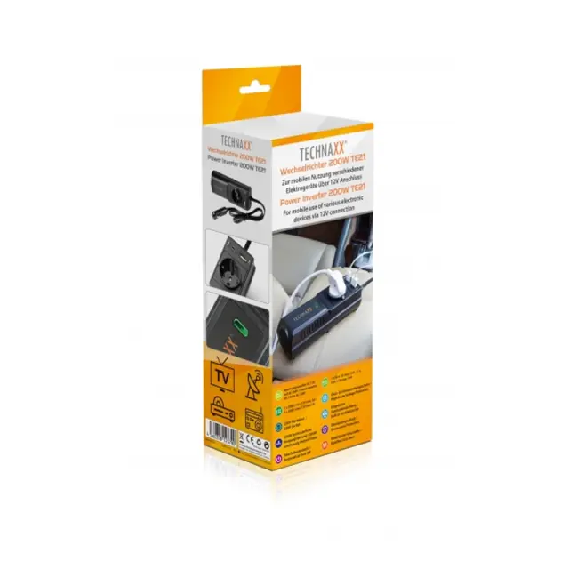 Pretvornik 12 V na 230 V 200 W Technaxx TE21. Za mobilno uporabo različnih elektronskih naprav prek 12V povezave.