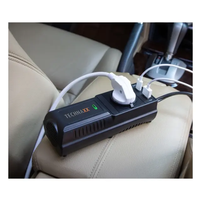 Pretvarja 12V DC baterijo v standardno 230V AC (gospodinjsko) napajanje, za delovanje različne elektronike, npr. tablični računalniki, pametni telefoni, prenosni računalniki, igralni sistemi, majhni televizorji, DVD/MP3 predvajalniki, dodatki za kampiranje, GPS enote in še veliko več