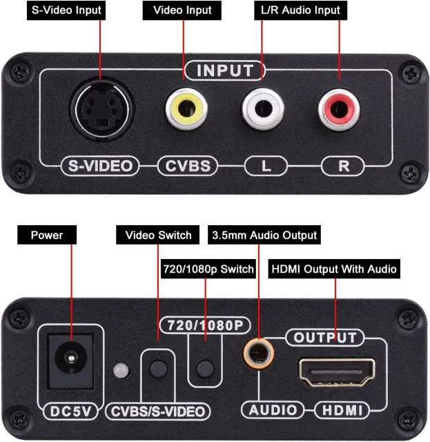 Video pretvornik podpira dva načina pretvorbe, iz S-video v HDMI in iz AV v HDMI. Oba izhoda za avdio signal imata vmesnik L/R - HDMI. Podprti ločljivosti sta 720P in 1080P.