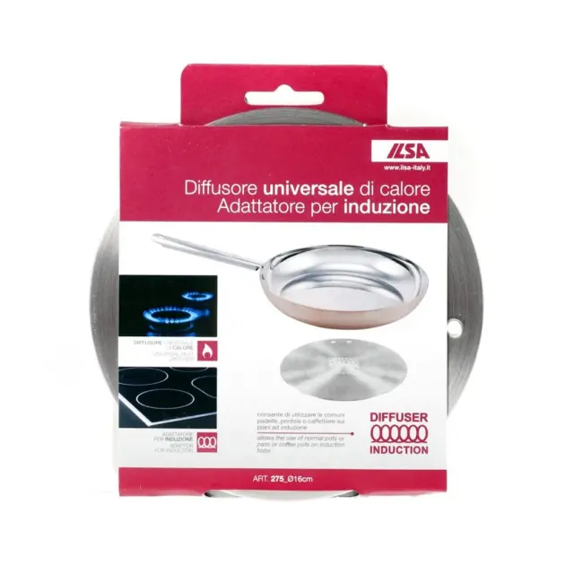 Ilsa pretvornik (adapter) za indukcijo s premerom 16 cm je univerzalni toplotni difuzor, izdelan iz treh plasti kovin: feritnega jekla (ki pride v stik z indukcijsko kuhalno površino), aluminija na sredini (za spodbujanje širjenja toplote) in nerjavečega jekla 18/10. Zahvaljujoč tem lastnostim je pretvornik vsestranski pripomoček z dvema načinoma uporabe: dejansko ga je mogoče uporabiti kot univerzalni toplotni razpršilnik na plinskem štedilniku ali kot adapter za indukcijske plošče. Kot toplotni razprševalnik, ki je nameščen med virom toplote in loncem, vam omogoča enakomerno in stalno porazdelitev toplote, s čimer se lahko izognete pogostemu mešanju hrane. Na indukcijskih kuhališčih pa omogoča uporabo običajnih loncev, ponev, kafetier in druge posode, ki kot take nimajo primernega dna, ki bi prijelo na indukcijo. Pretvornik dopušča uporabo jeklenih ali aluminijastih posod z različnimi premeri in tako pomaga aktivirati indukcijsko kuhalno površino. Opremljen je s snemljivim praktičnim ročajem iz nerjavečega jekla, ki vam omogoča enostavno odstranitev pretvornika s kuhalne plošče. Med uporabo je potrebno ročaj odstraniti. POMEMBNO: Pretvornika ne puščajte na delujoči grelni površini, brez da bi na njem bila posoda, saj lahko v tem primeru pride do poškodb tako adapterja kot indukcijske plošče. Izogibajte se prekomerni toplotni energiji na plošči.