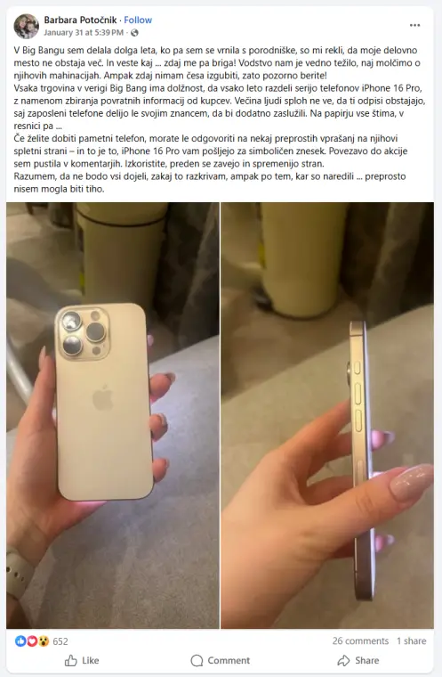 V zadnjem času se na Facebooku pojavljajo lažne objave, ki zlorabljajo ime podjetja Big Bang in zavajajo uporabnike z neresničnimi ponudbami. Gre za objave, ki zatrjujejo, da lahko potrošniki z le nekaj kliki ali komentarji skoraj brezplačno pridobijo električni skiro, prenosni računalnik in podobno.
