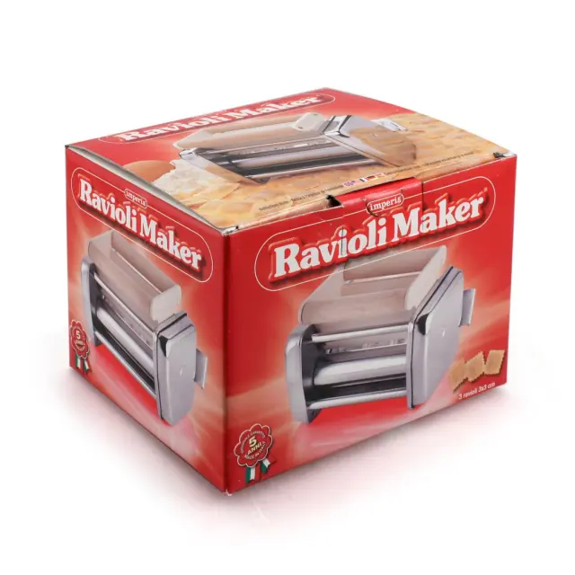 IMPERIA PRIKLJUČEK ZA RAVIOLE iz linije Ravioli Maker je odličen za pripravo svežih domačih raviolov velikosti 5 x 5 cm. Nastavek se prilega strojčku za testenine Imperia in Titania. Položite trak sveže pripravljenih testenin na valje, mednje pa dodajte želeno polnilo. S pomočjo nastavka boste naredili dve vrsti kvadratnih raviolov. V kompletu je priložen tudi rezalnik – valjar za dodelavo in tesnjenje raviolov ter čopič za odstranjevanje odvečne moke.