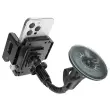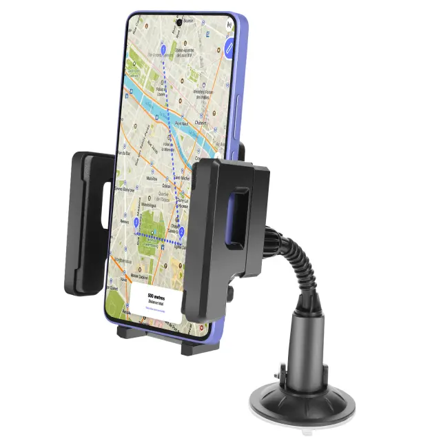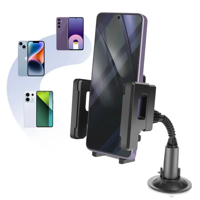 Nosilec za avto z močnim priseskom za stabilno pritrditev na vetrobransko steklo ali armaturno ploščo. Fleksibilen pecelj in vrtljiva glava za namestitev telefona pod poljubnim kotom. Univerzalna združljivost z nastavljivimi sponkami za večino pametnih telefonov. Robustna zasnova s trpežnimi materiali za dolgotrajno uporabo.